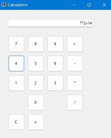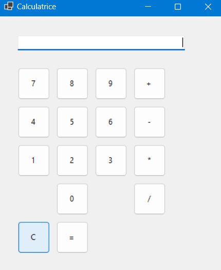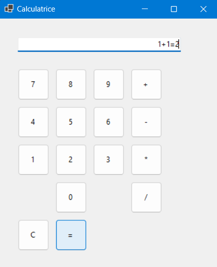 Création de l’application avec C# et Windows Forms en utilisant des boutons et des contrôles standards. Gestion des expressions via la classe DataTable pour garantir des calculs exacts.