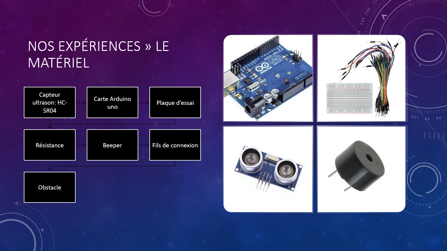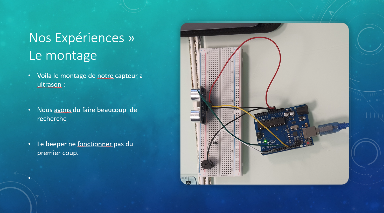 Un capteur à ultrason (HC-SR04), une carte Arduino Uno, et un beeper ont été utilisés pour tester et illustrer ce processus.