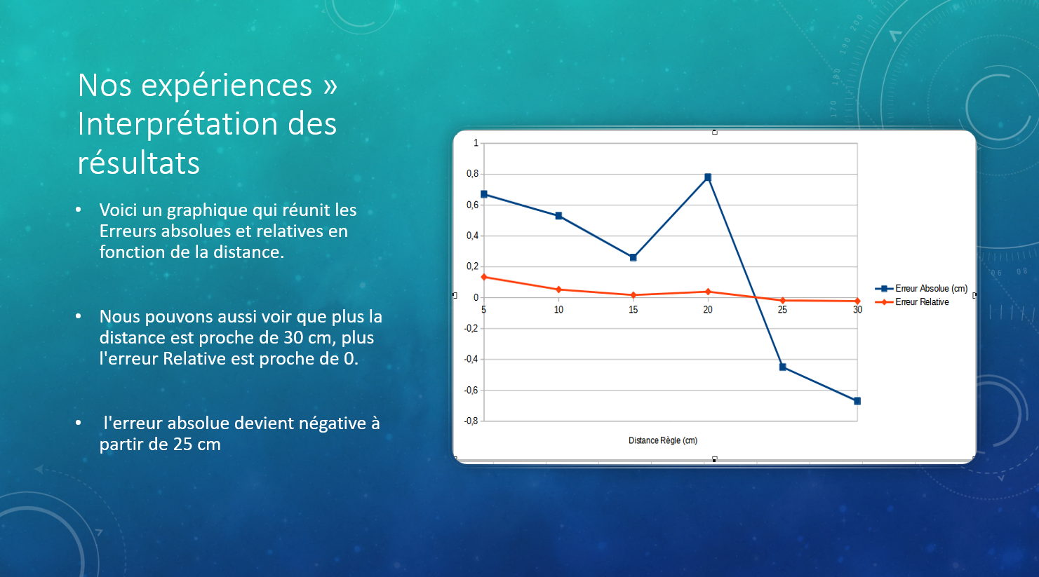 Un graphique montre que plus la distance est proche de 30 cm, plus l'erreur relative est faible.